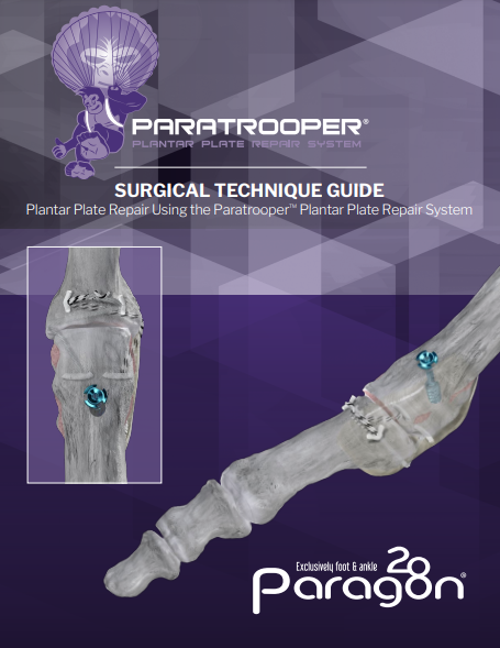 The Paratrooper® Plantar Plate Repair System is designed for simplicity – surgeons will perform a single pass of the suture through the plantar plate deploying an anchor and then be able to tension and position the toe in the desired position. Paragon 28 has eliminated the need for complex inserters and instead leveraged a streamlined curved needle to pass the implant in tight spaces.
